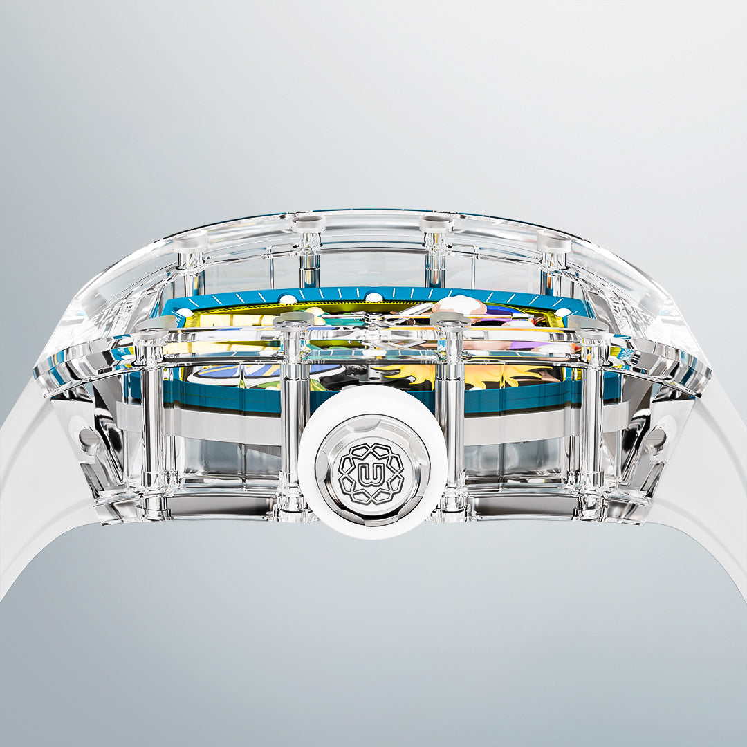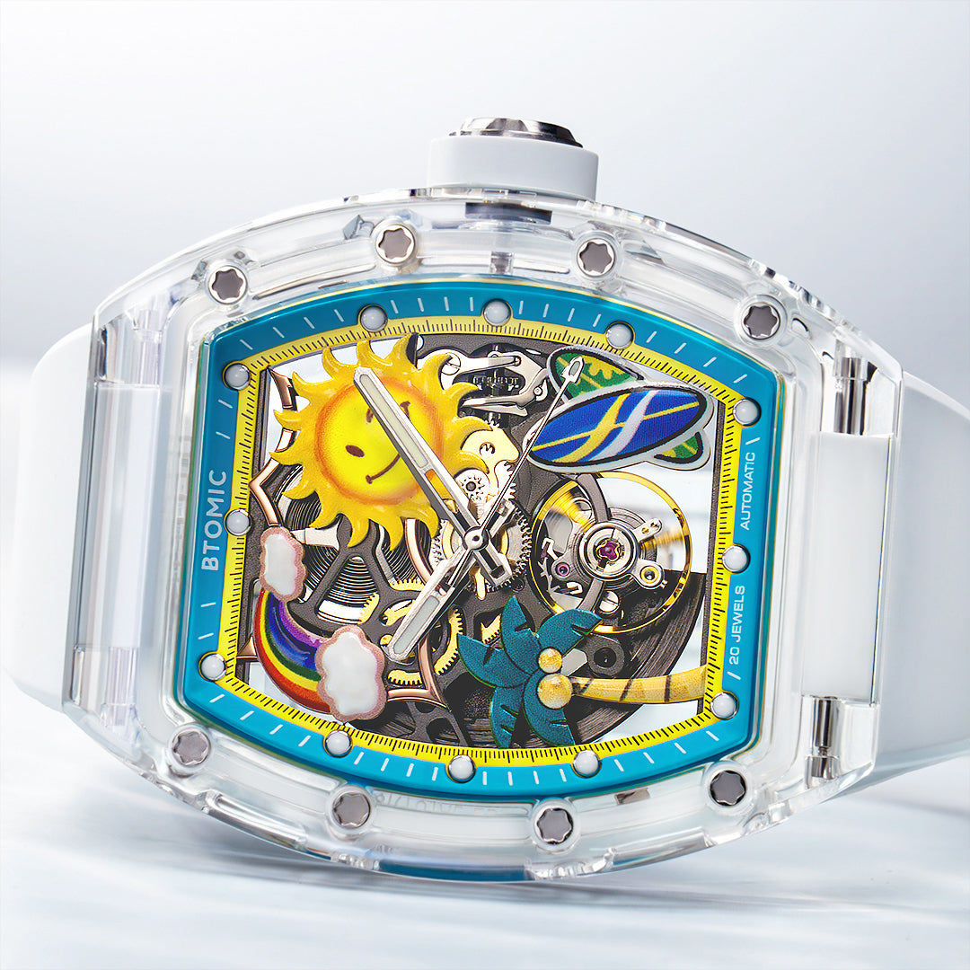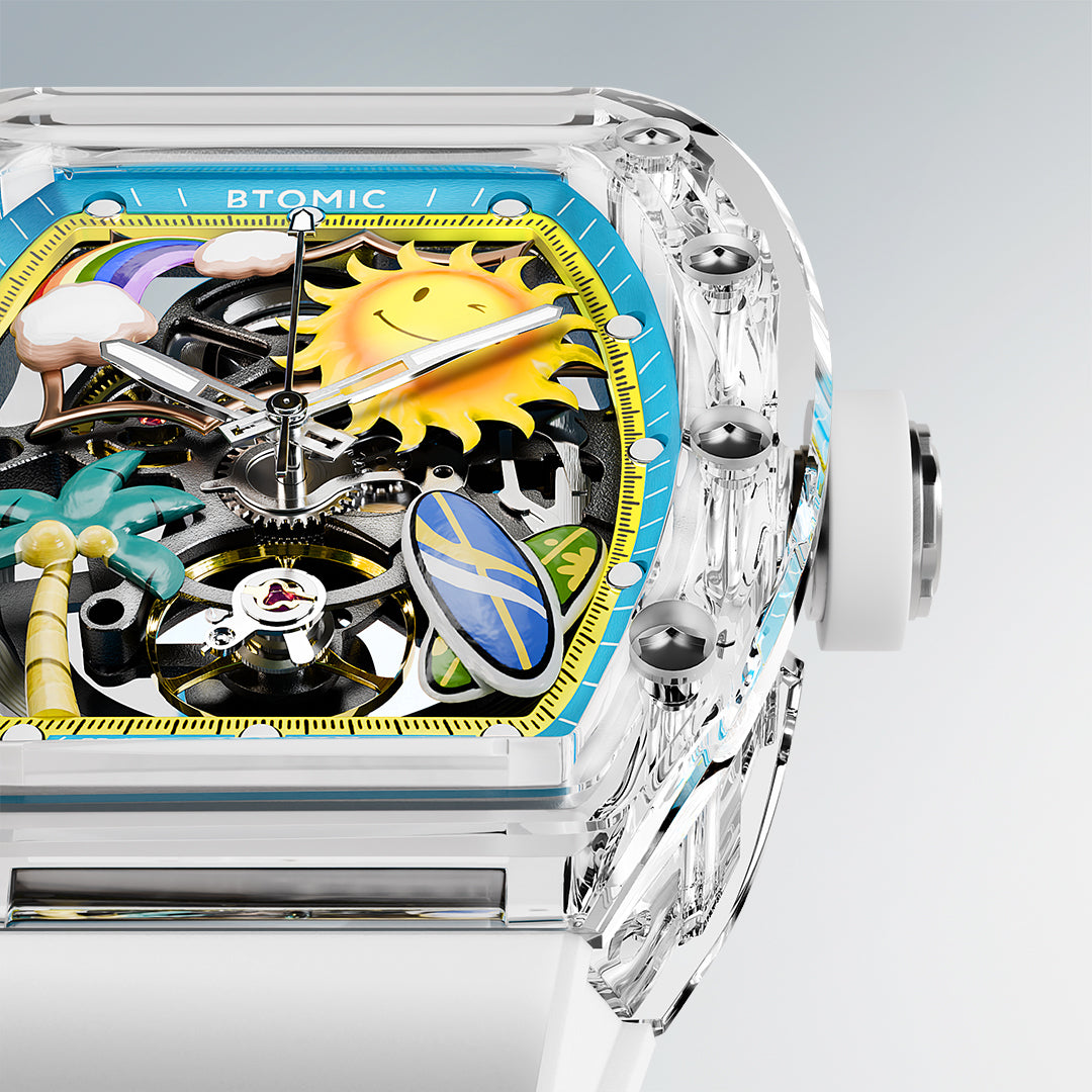 An endless fascination with tropical scenery profoundly influenced the design of the BA-238. After layers of selection and adjustments, we chose a movement design that best matched the dial components—a fly wheel that beats in sync with the waves.
