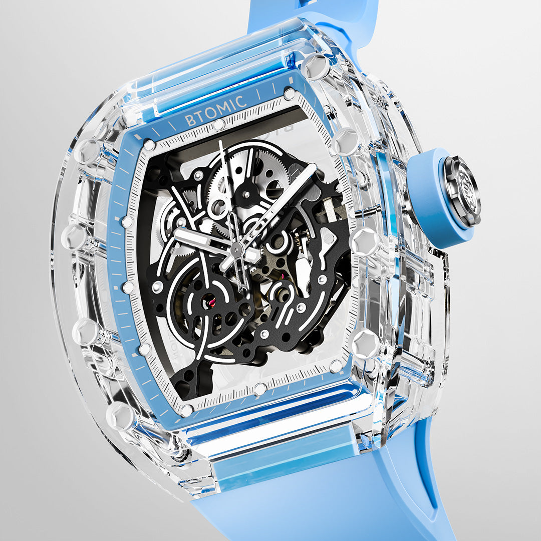 Geïnspireerd door de kunst van het visualiseren van tijd bevrijdt het ontwerp zich van metalen beperkingen en onthult het pure mechanische schoonheid via een transparante, tonvormige kast die het ritme van het uurwerk toont.