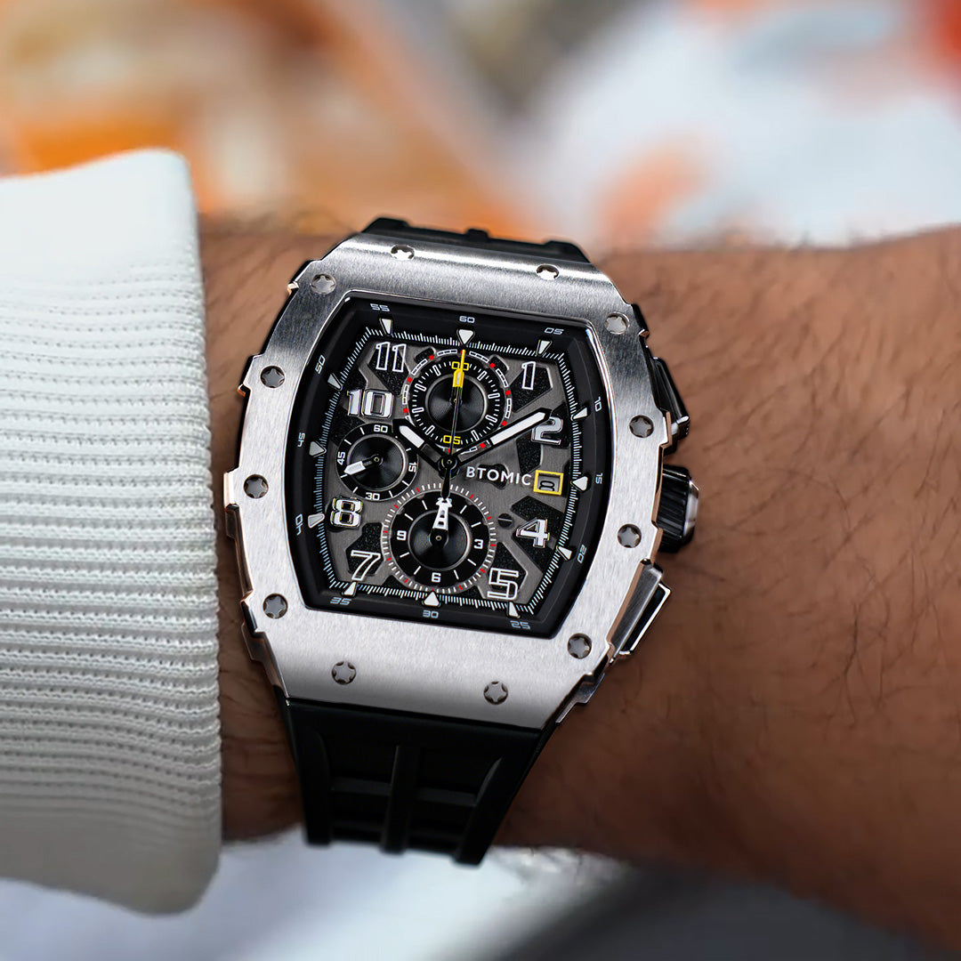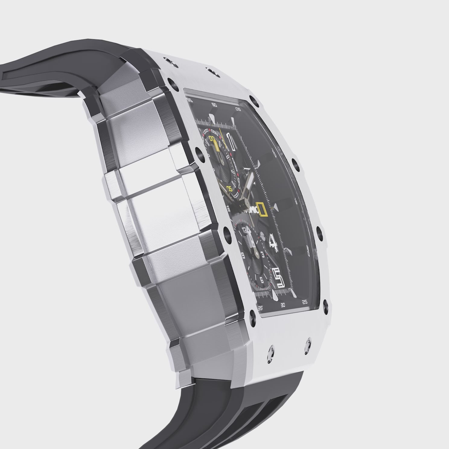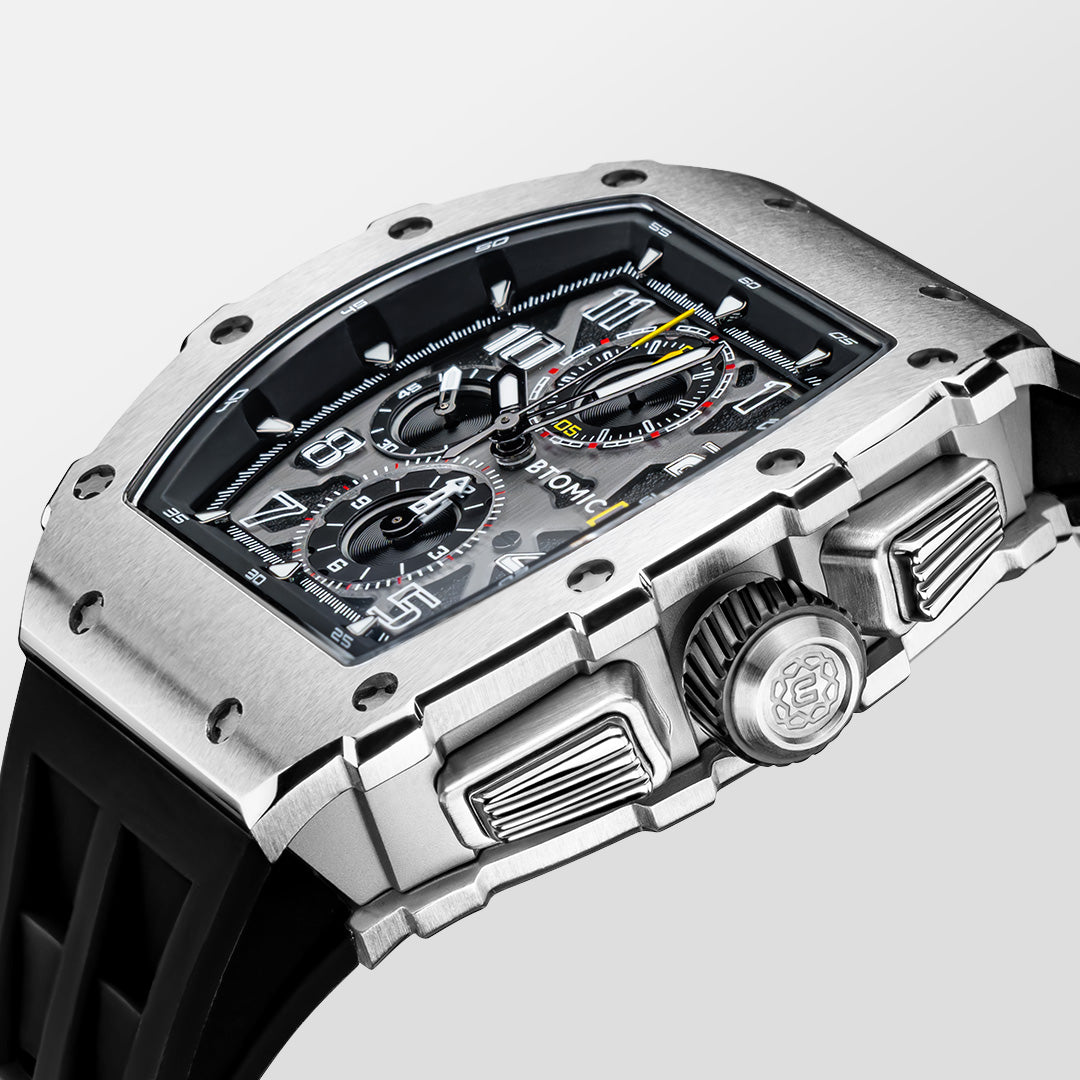 Inspired by motorsports, this watch merging sporty design with refined craftsmanship. Its dial mirrors the look of a race car dashboard, delivering both precision and a sense of speed in every moment.
