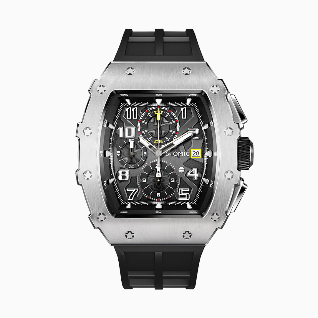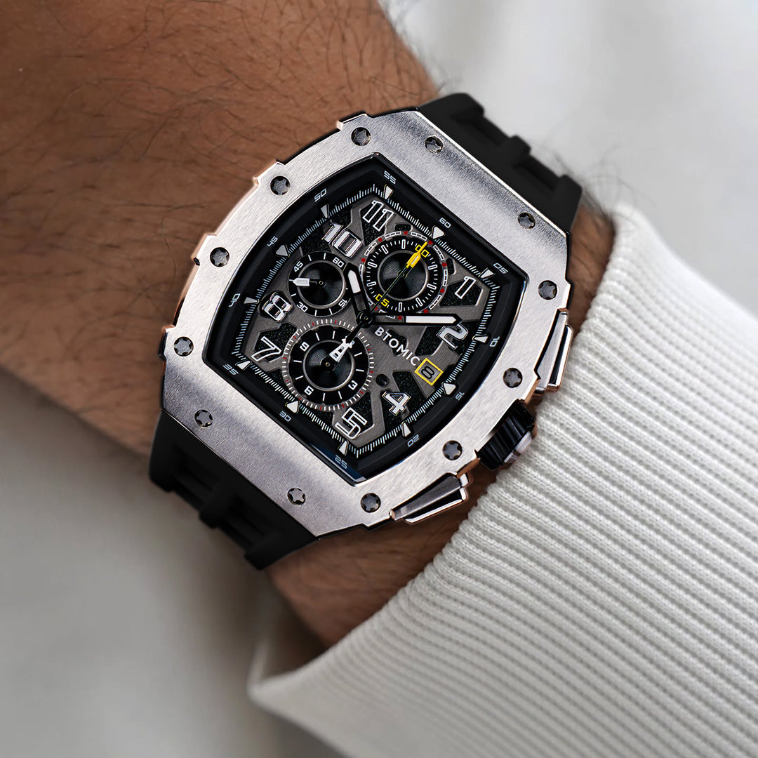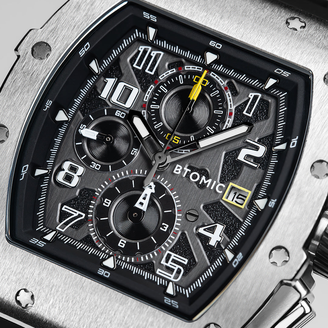 Inspired by motorsports, this watch merging sporty design with refined craftsmanship. Its dial mirrors the look of a race car dashboard, delivering both precision and a sense of speed in every moment.